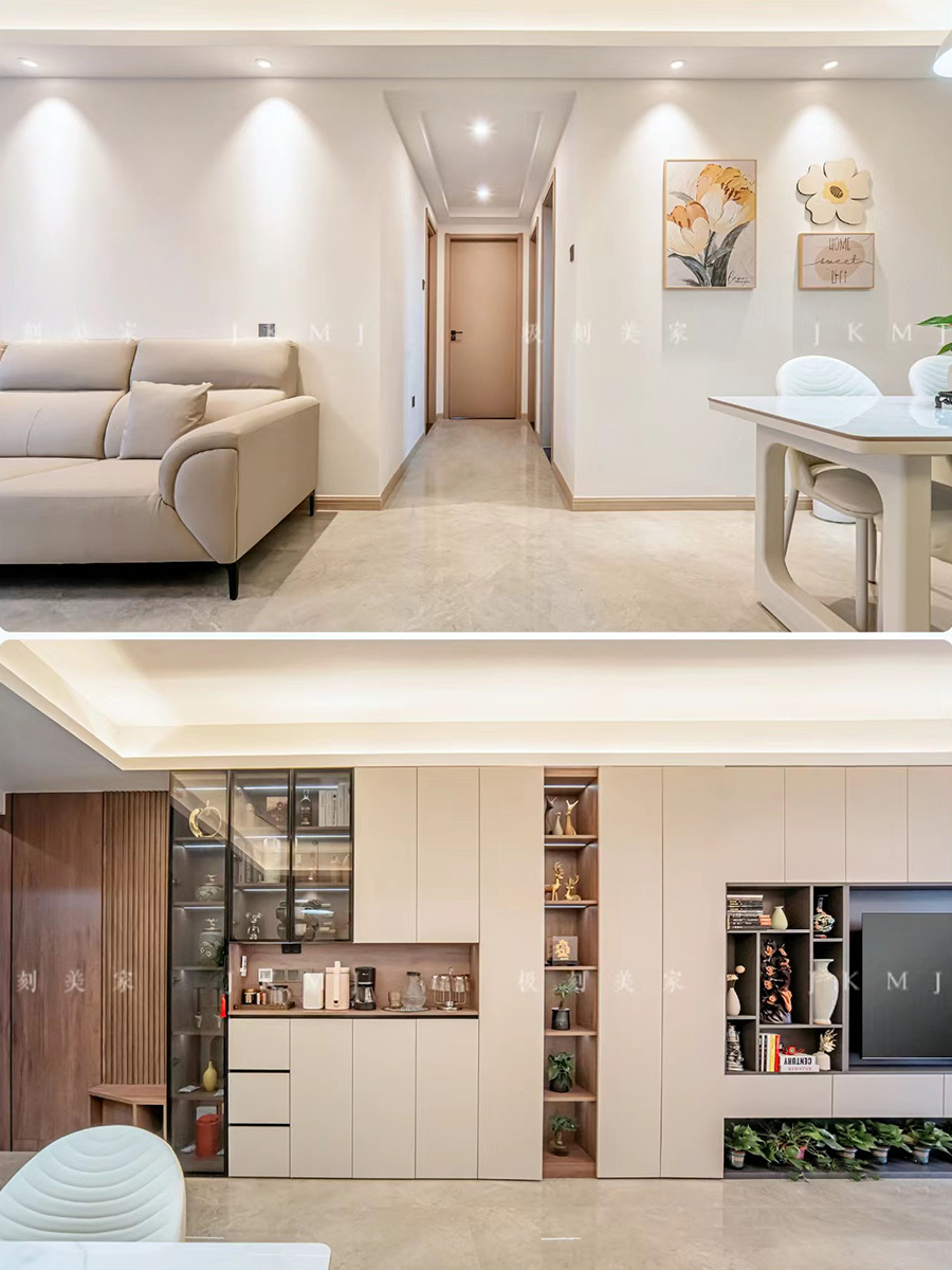入戶柜連接餐邊柜、電視背景墻,充分利用空間,滿足收納需求