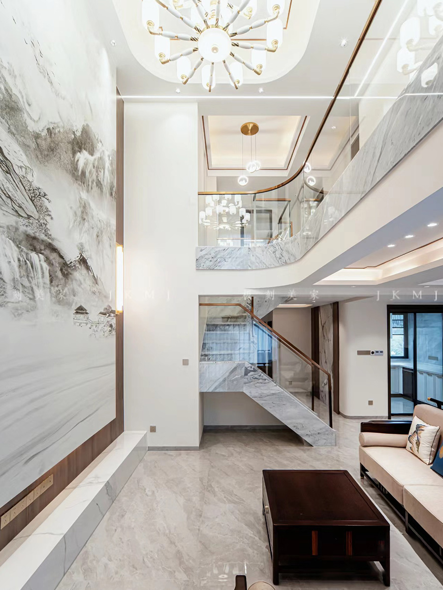??挑空的客廳江兩層的建筑空間打通,以中式葵紋為靈感、以國(guó)畫山水大理石做背景