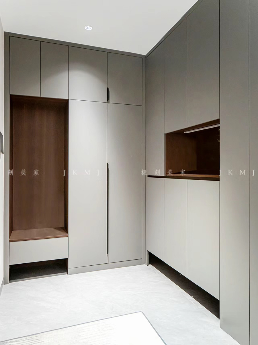 L型轉(zhuǎn)角鞋柜,轉(zhuǎn)角位置與沙發(fā)背景墻做一體設(shè)計(jì),搭配隱形門(mén),空間整體性更強(qiáng)