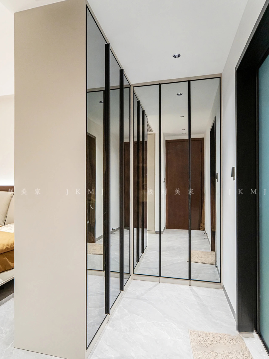 懸浮電視柜加上內(nèi)嵌電視背景墻,連接走道收納柜,設(shè)計(jì)感十足