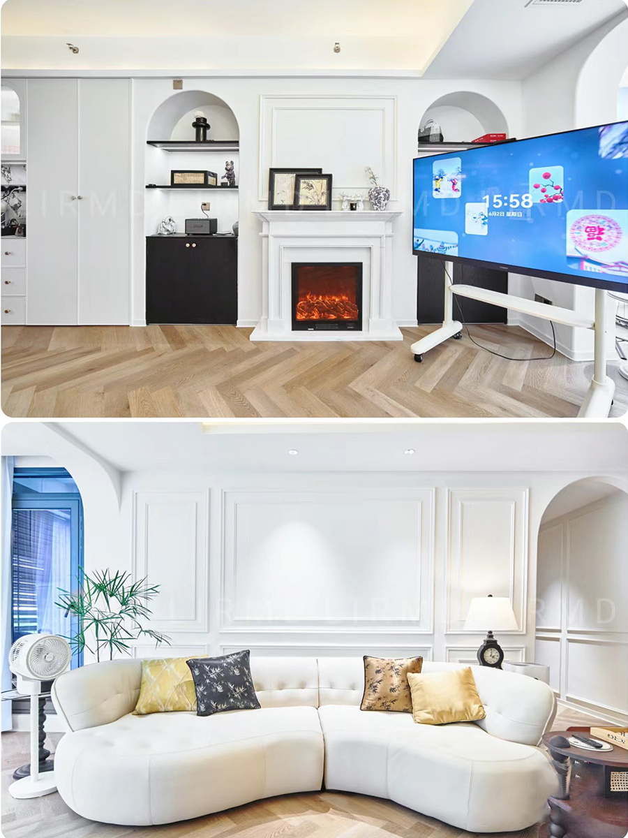 餐邊柜位置用寶格麗巖板做開放長格式設(shè)計搭配軌道插座,方便放置家用電器。上方長虹玻璃搭配,更加凸顯法式復(fù)古。搭配壁爐裝飾,更加凸顯高級奢華。