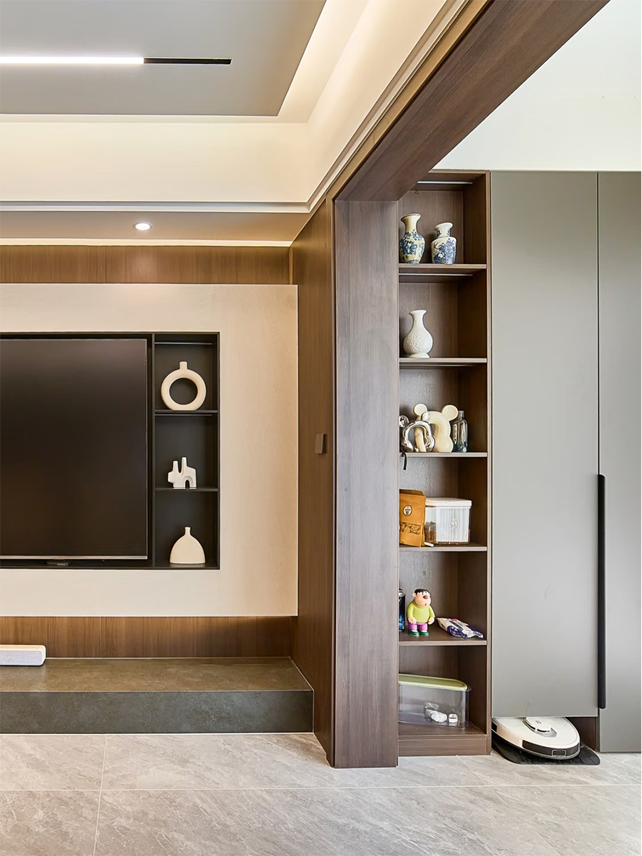 深棕色木飾面和灰色護(hù)墻板,展現(xiàn)沉穩(wěn)優(yōu)雅的格調(diào),肌理溫潤(rùn)自然。