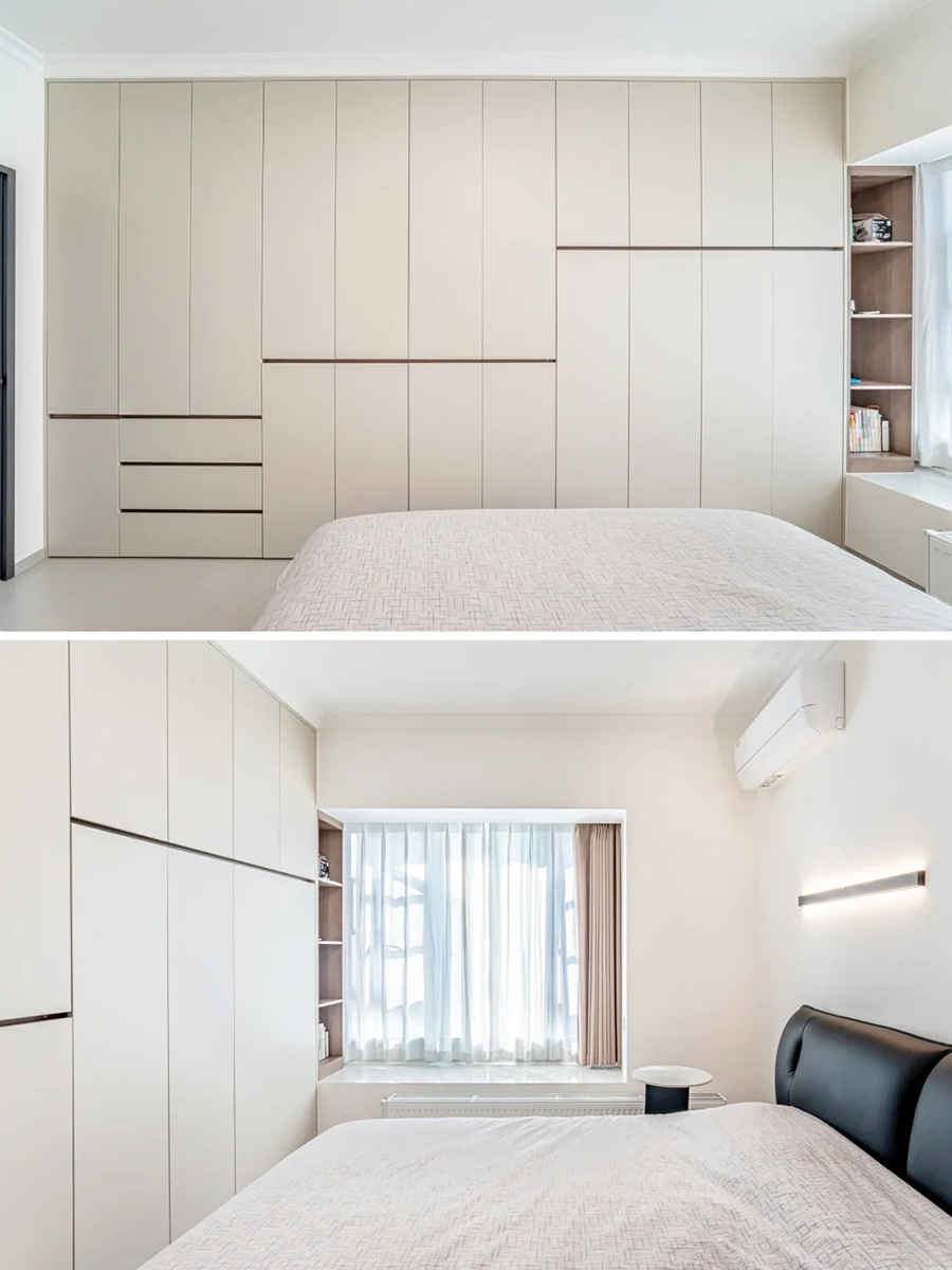 主臥設(shè)計(jì)的L型衣帽間,采用屏風(fēng)隔斷,解決風(fēng)水問(wèn)題也兼顧了采光。