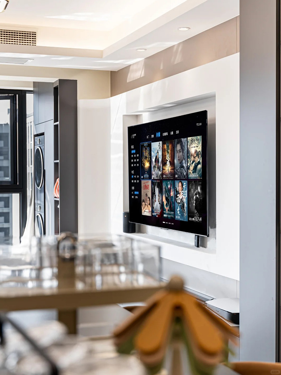 懸浮電視背景設(shè)計(jì),電視內(nèi)嵌預(yù)留后期可更換的位置。