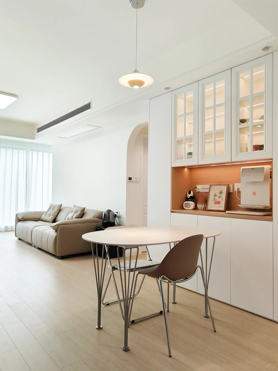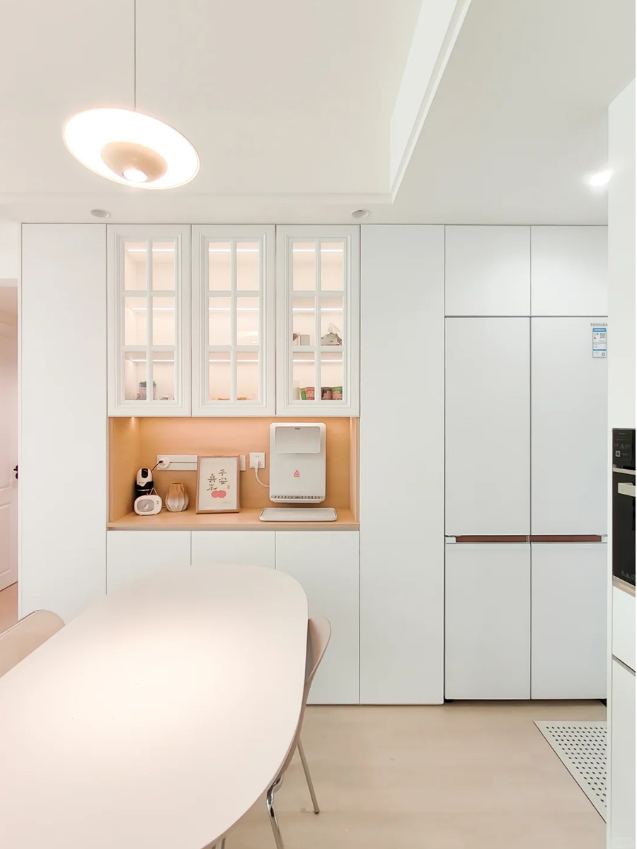 冰箱嵌入嚴(yán)絲合縫,藏露有致的三分段餐邊柜成為點(diǎn)睛亮點(diǎn)。
