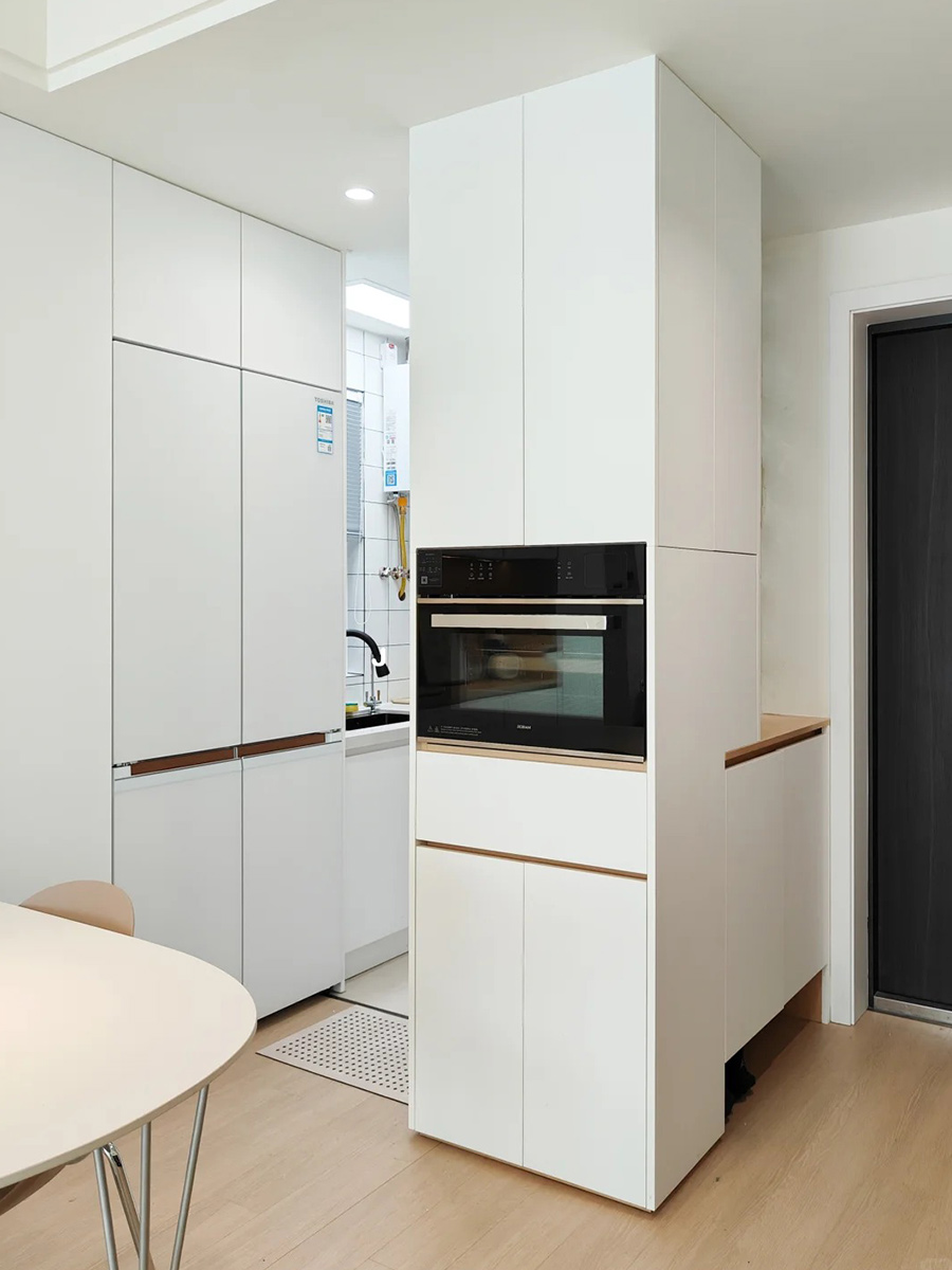 入戶鞋柜和餐邊柜結(jié)合,側(cè)旁做嵌入式蒸烤箱,空間利用率高。