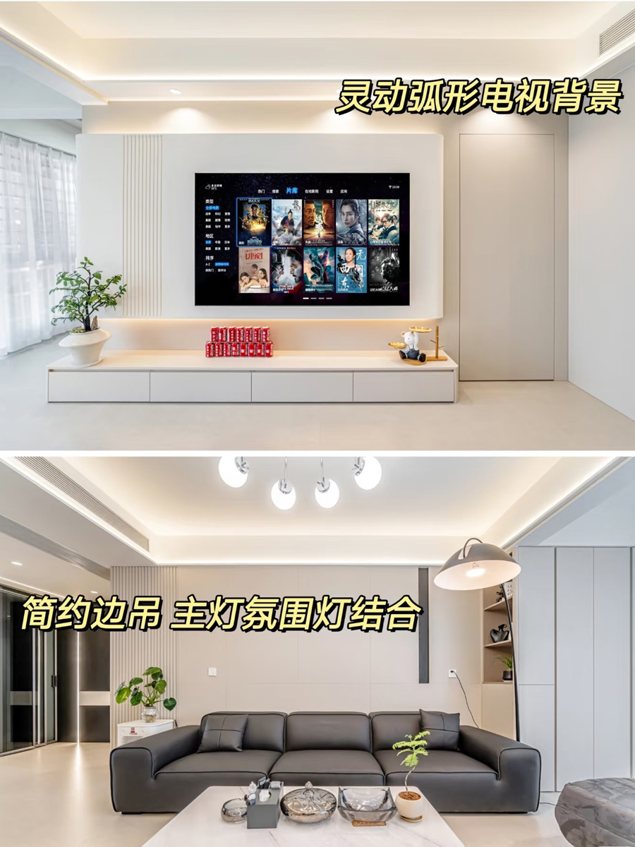電視背景用石膏板做圓弧懸浮造型,底下搭配地臺(tái),空間柔和有設(shè)計(jì)感。