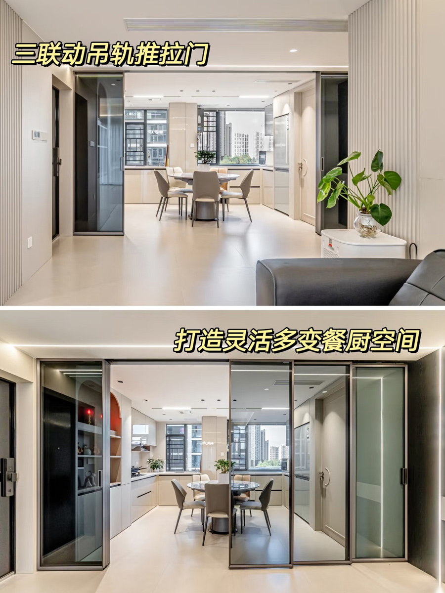 打通一間小臥室,搭配三聯(lián)動(dòng)吊軌玻璃推拉門,餐廚一體動(dòng)線流暢,南北通透。