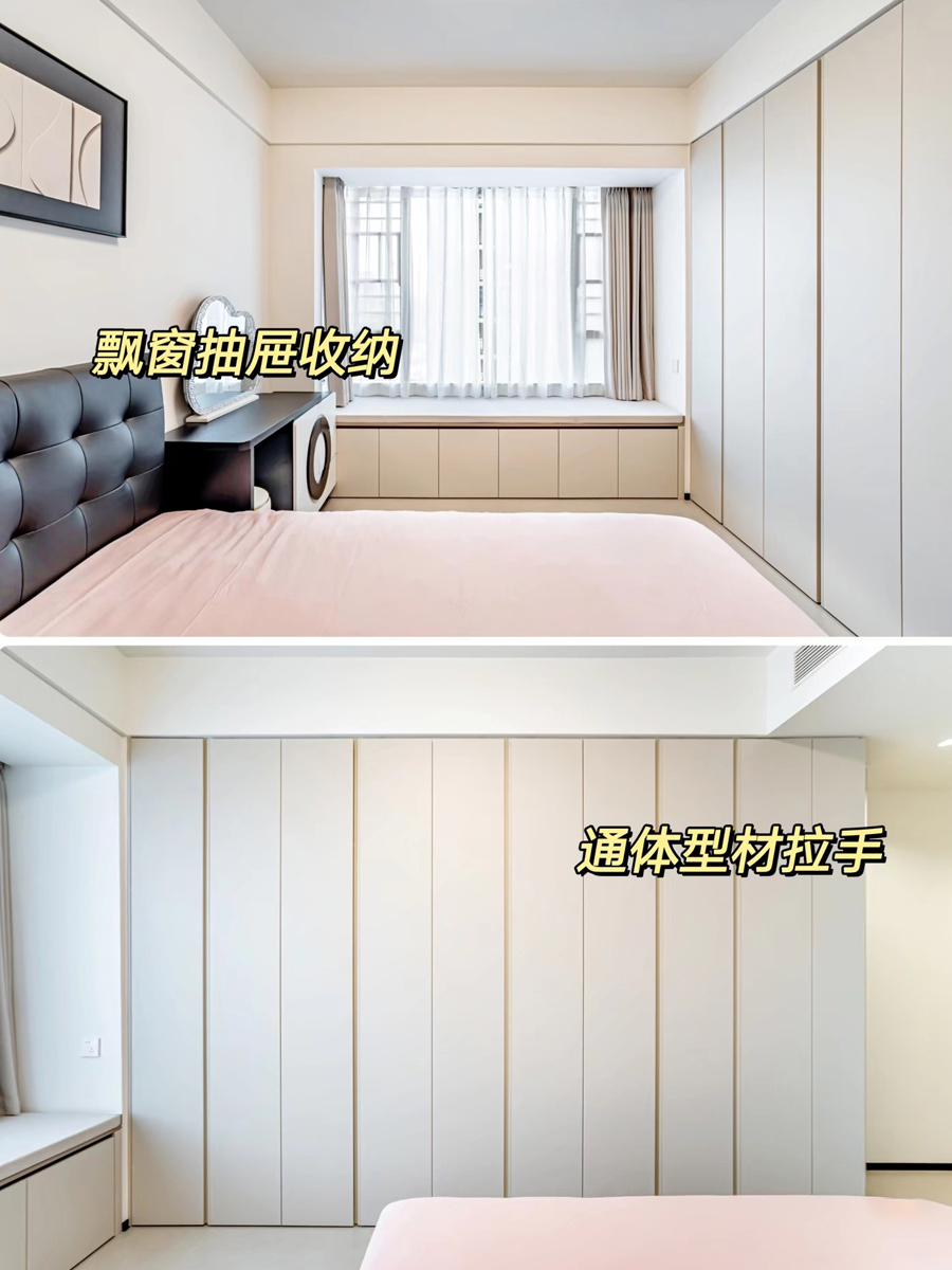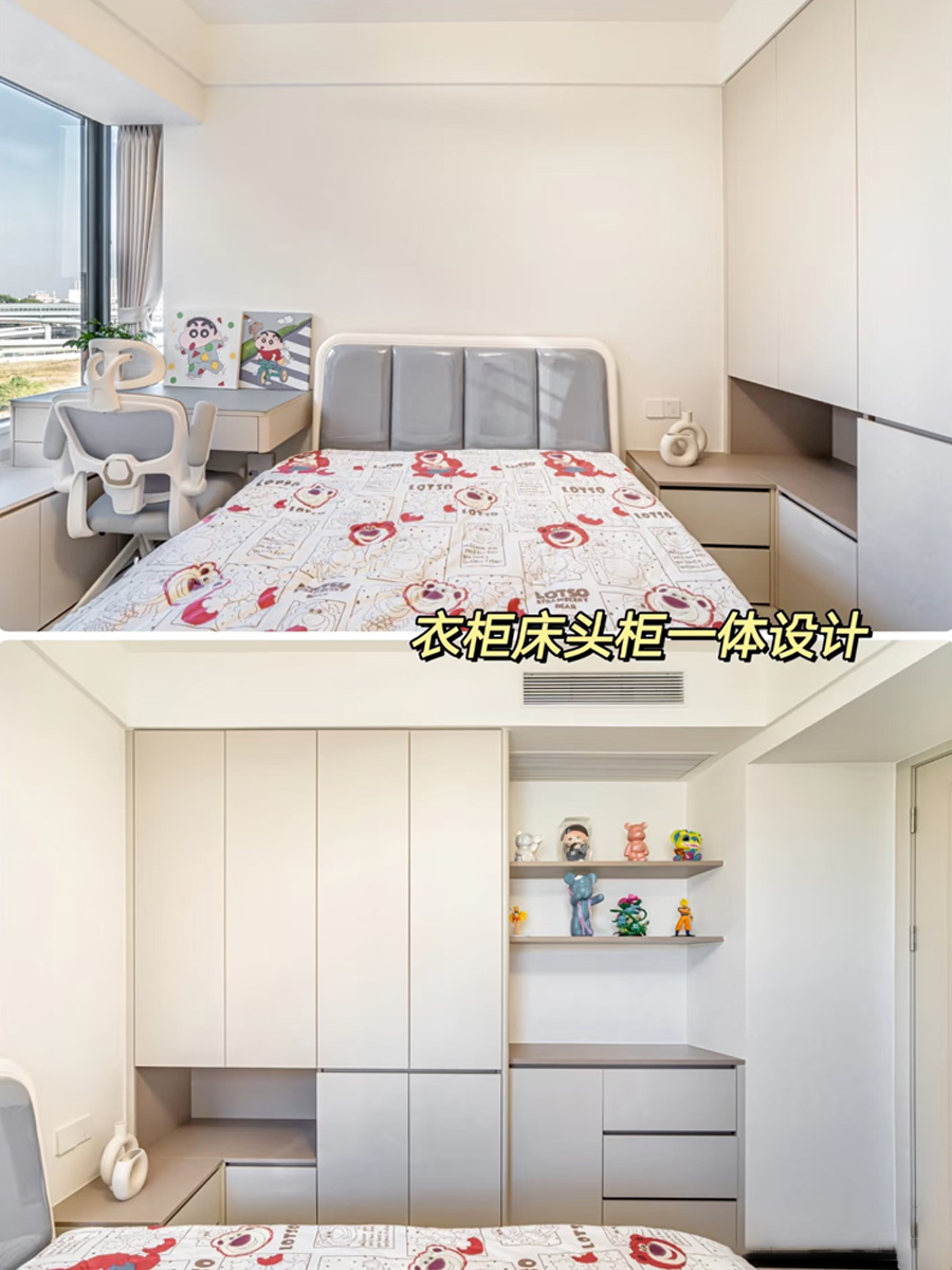 兒童房做圓弧轉(zhuǎn)角、分段免拉手設(shè)計(jì),不怕磕碰受傷。衣柜床頭柜一體簡(jiǎn)約省空間