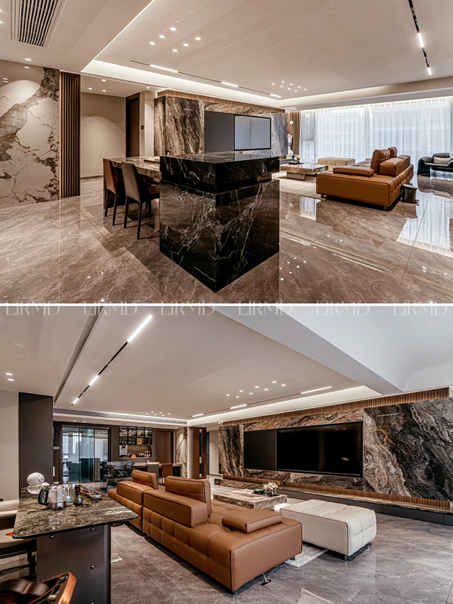輕于形 奢于質 意式輕奢 整體色調高級深灰色調搭配,用巖板打破整體空間深沉感,讓空間層次和效果體現(xiàn)更高級感。