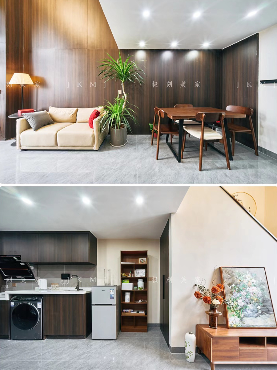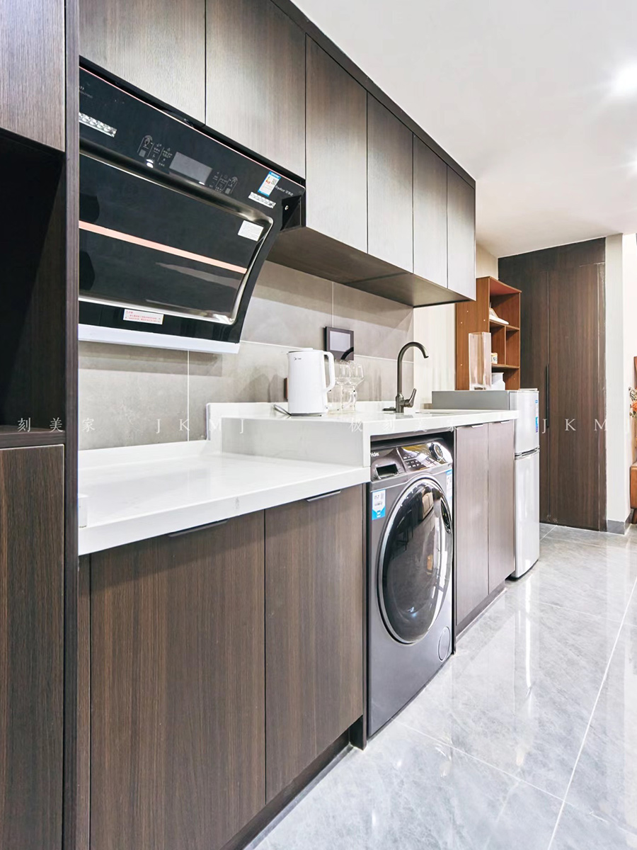 大面積的深色木紋墻板,配合深色的亮面地磚,更顯質(zhì)感