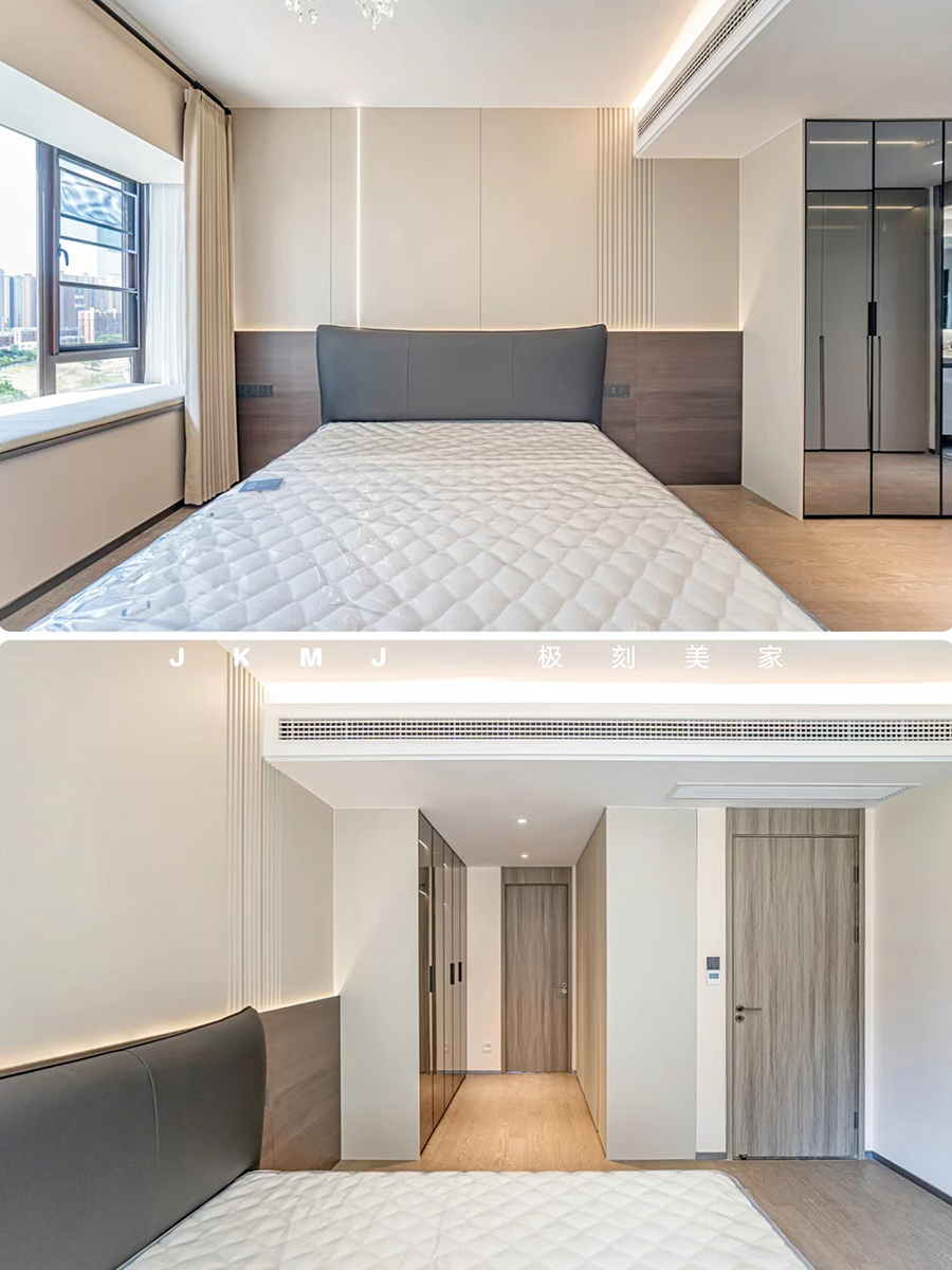 主臥做套間設(shè)計,衣帽間一面做玻璃鏡面柜門,一面做一門到頂免拉手,通透又方便。